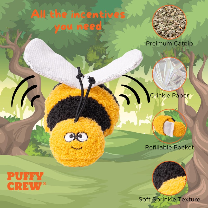 Puffy Crew Interactive Catnip Cat Plush Toy, Insect Theme, 5'', for All Breed Size Cats (Bee)
