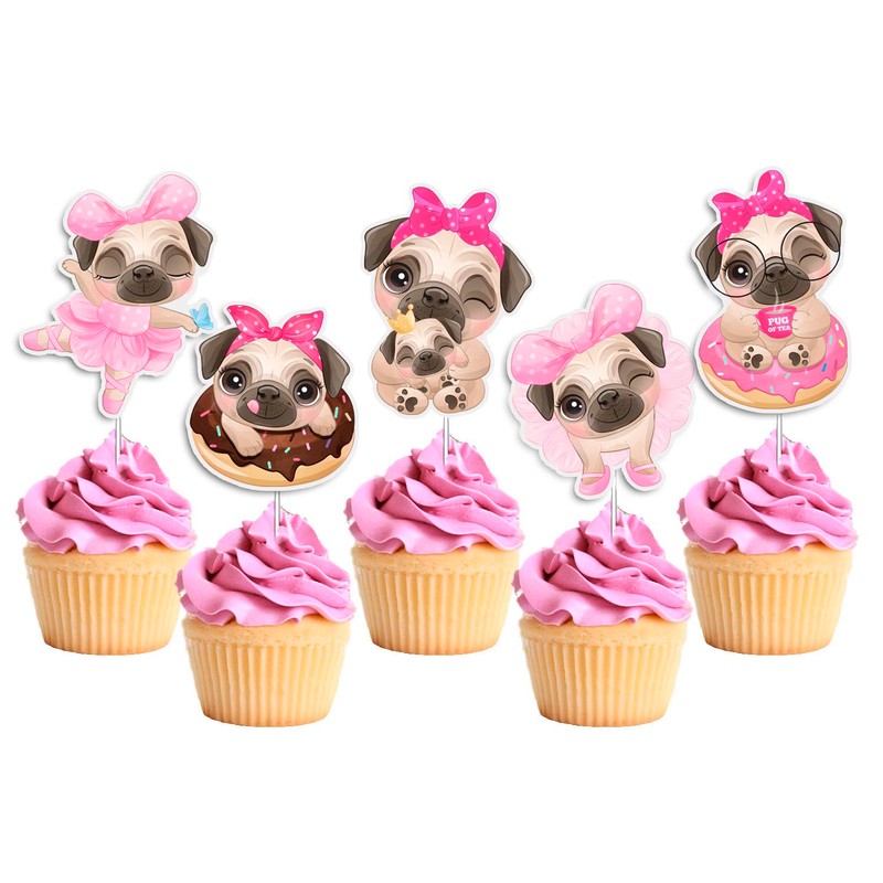 - Set includes: 10 Pug Cupcake Toppers 10 pieces White Sticks 10 stick dots.