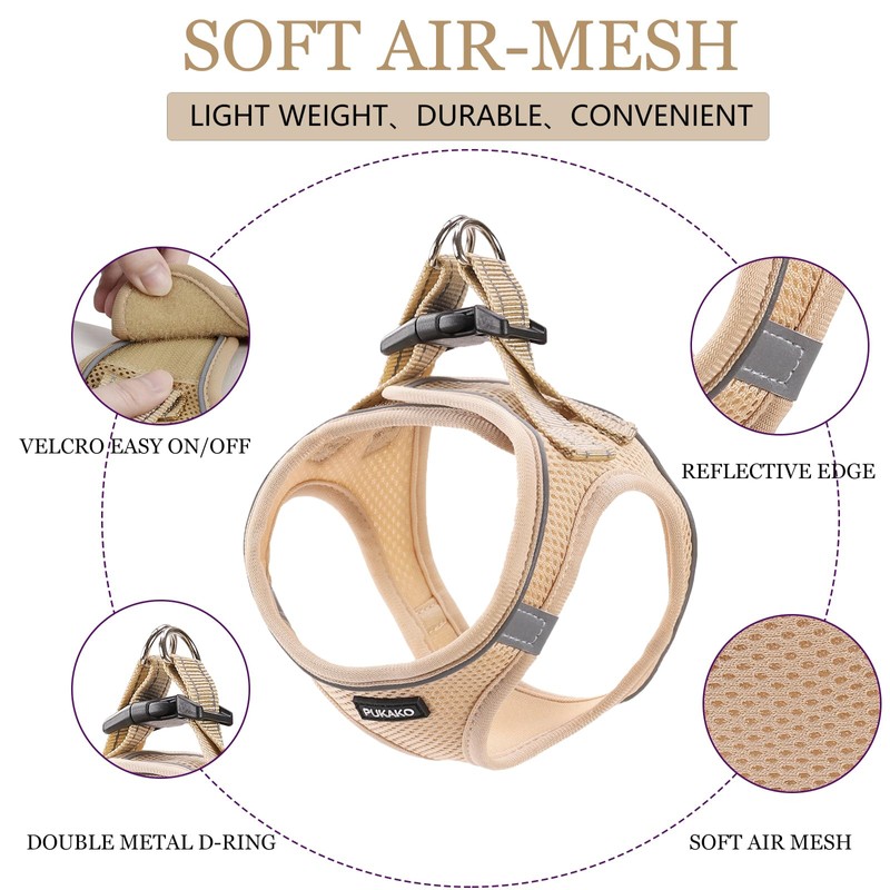 PUKAKO Puppy Harness and Leash Set, Small Dog Harness and Leash Set, Step in Small Size Harness with Soft Mesh and Reflective Bands for Extra-Small/Small Dogs, Khaki, M