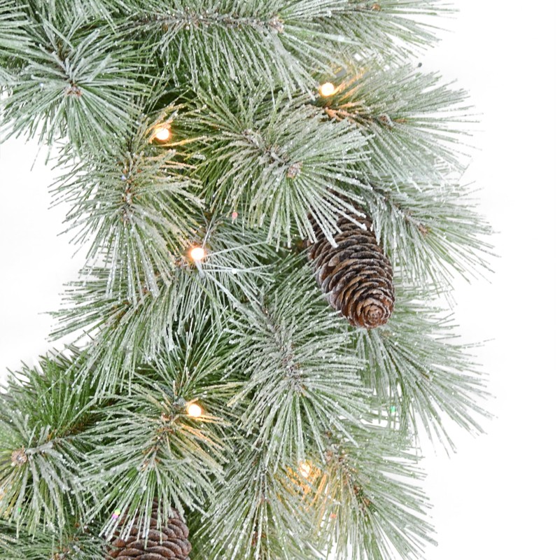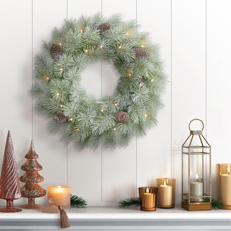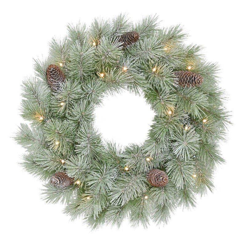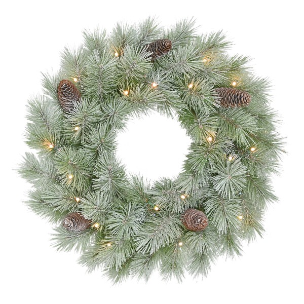 - 24" PRE-LIT BATTERY-OPERATED ON/OFF TIMER CHRISTMAS WREATH: Comes with 20 LED warm white lights, providing a soft, inviting glow. The lights are already integrated, so there is no need for extra installation and comes with an 8-16 hour on/off timer for your convenience. Please note: 3 AA batteries are not included with Puleo International 24" Pre-Lit Battery-Operated Artificial Flocked Wreath.