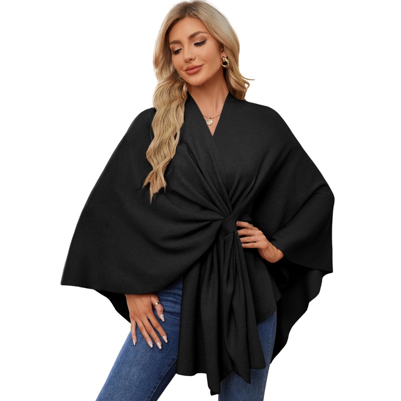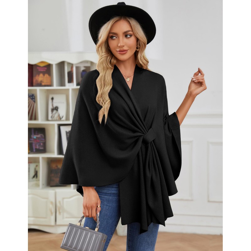 PULI Women's Elegant Poncho Knitted Ponchos Capes Open Front Versatile Scarf Wrap with Tab, black