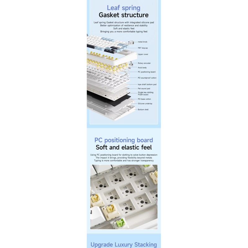 - 【Optimized 75% Compact Layout&Innovative Gasket Structure】The F75 redefines space efficiency with its 75% compact layout. This design integrates all the essential keys in a smaller footprint, making it perfect for streamlined desks and mobile setups without sacrificing functionality. Experience the pinnacle of comfort with the gasket structure. This advanced design ensures a flexible yet firm typing experience, reducing fatigue during prolonged use while maintaining a consistent and responsive key feel.