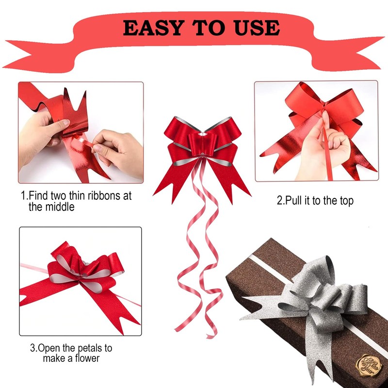 - 🪽【Include】Comes with 40 pieces of pull bows wrapping ribbon knot, meet your demands to decoration your gifts,cars, or weddings.It can not only decorate your home, but also create a happy holiday atmosphere and light up the whole Christmas atmosphere.