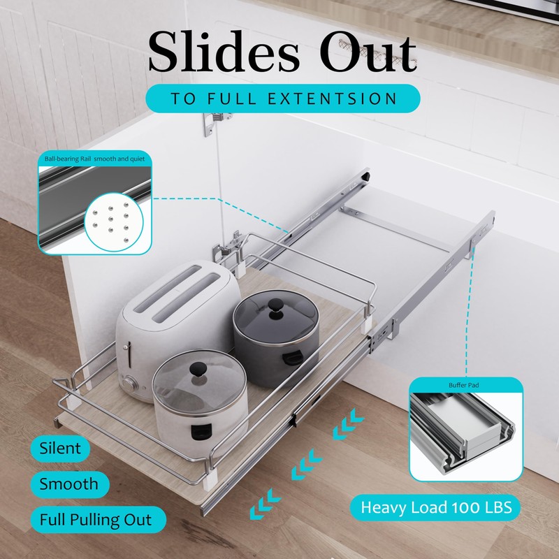 - Smooth and Quiet Sliding Drawer with Full-extension Ball Bearing System: The entire drawer can be fully withdrawn for easy installation and flexible access to storage items. The ball bearings allow you to pull smoothly and noiselessly even under the weight of kitchen mixers, pots and pans, and other kitchen utensils.