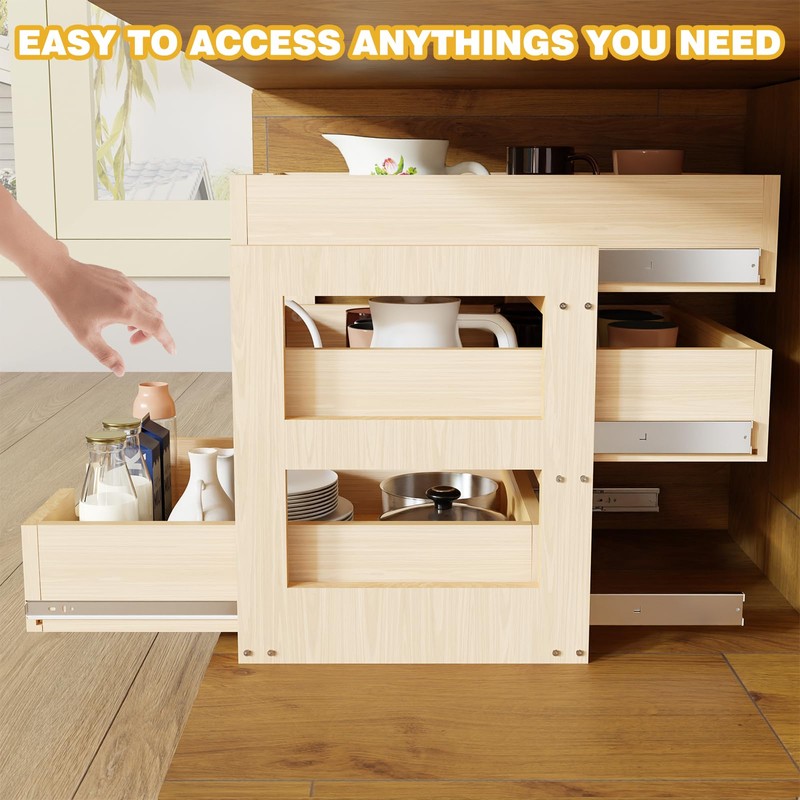 Pull Out Cabinet Organizer, 14''W×21''D×19''H Soft Close Slide Out Wooden Pull out Drawers, Three Tier Slide out Wood Cabinet Organizer, for Base Cabinet Organization in Kitchen, Pantry, Bathroom