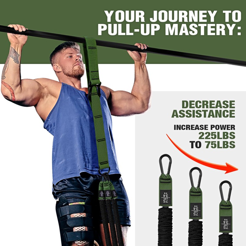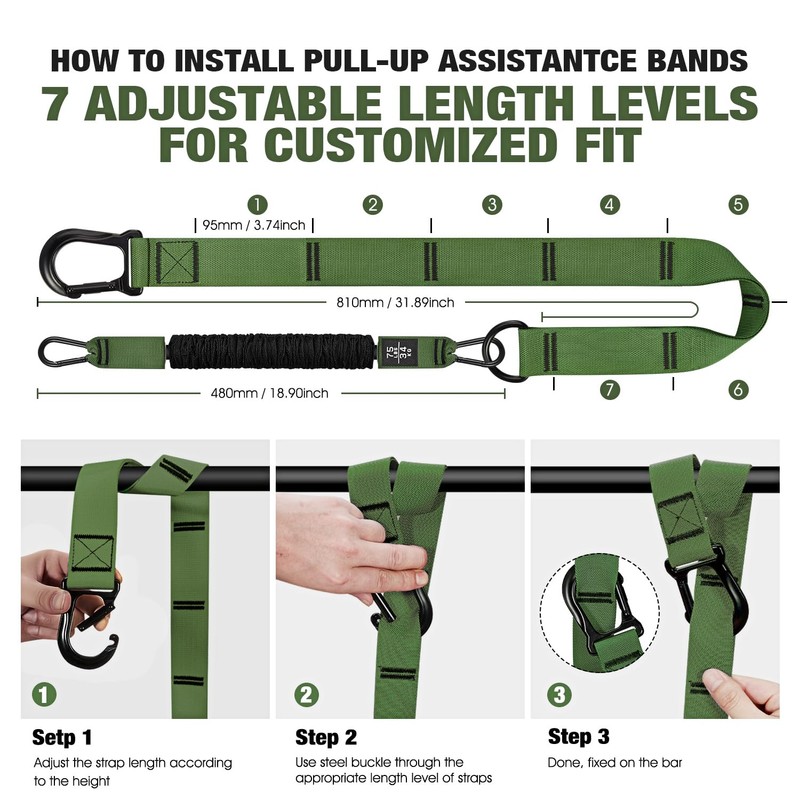Heavy Duty Pull up Bands: Revolutionize Your Fitness Journey Do you long to enhance your pull up capabilities? Our pull up assistance bands are here to give you a powerful boost! These bands not only precisely target and fortify your arm, back, and chest muscles but also offer remarkable support for improving leg strength. Whether you use it with both feet or knees, you can effortlessly adjust the length of the band according to your body height and preferred resistance. It can be conveniently attached to any gym or home pull up bar, allowing you to start an effective workout anytime and anywhere. Moreover, a travel carry bag is thoughtfully provided, especially designed for fitness enthusiasts on the go. Whether you use a ceiling pull up bar or set up at home, our heavy-duty construction and versatile resistance levels (up to 225 lbs) can meet the needs of all fitness levels. It's time to significantly elevate your workouts with our indispensable pull up bar assistance bands. Bid farewell to the arduous struggle of full-weight pull ups and welcome the new era of strength improvement and progress with our assisted pull up bands. Through this innovative system, you can gradually strive towards full-weight pull ups. Safety is always our top priority. That's why a high-quality protective sleeve and sturdy metal carabiners are included in the pull up assist band set. Empower yourself with the reliability to break boundaries and achieve a perfect pull up every single time. Are you ready to take your pull up training to a higher level? Our Pull up bar Assist Set is about to bring a revolutionary change! The design takes into full consideration your comfort and strength-building needs, aiming to transform your chin-up routine. What's included in the set: Adjustable-length strap with comfort padding foot strap 3 stackable resistance bands (up to 225lbs) Durable nylon sleeve and heavy-duty carabiners Double metal rings, suitable for all genders