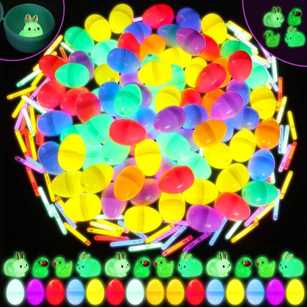 PullCrease 640 Pcs Easter Eggs Filled with Glow in the Dark Easter Hunt Party Basket Stuffers with 180 Eggs 360 Loose Mini Luminous Sticks, 100 Luminous Mini Resin Rabbits and Ducks