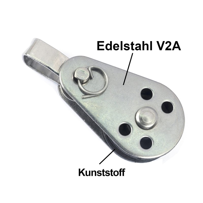 - Features: Product type: deflection pulley, pulley, block pulley, pulley, pulley, nylon roller. The smooth roller ensures good movement. The upper part is firm and the rope is easy to handle. The attachment eyelet cannot be rotated and thus prevents the rope from twisting. The surfaces are rounded without edges and thus protect against risk of injury to the hands. Ideal for fibre rope, wire rope, stainless steel rope, synthetic ropes and much more.