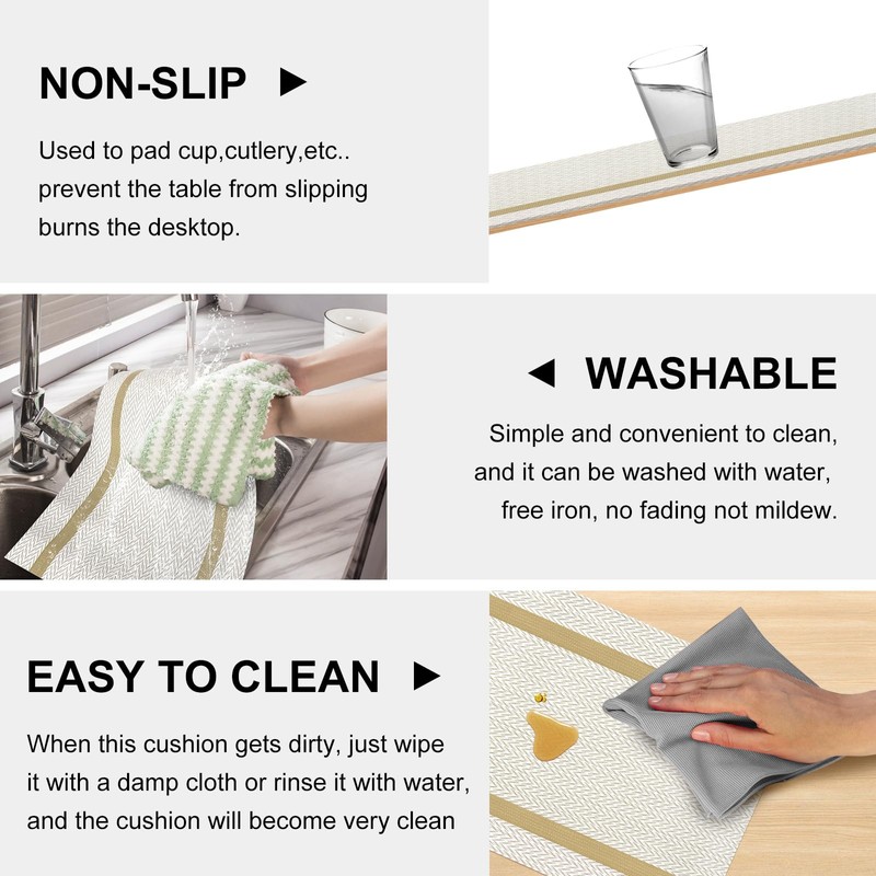 - Easy care: If the placemat is dirty, simply wipe the dirt off with a damp cloth or place it under the tap sink. The stains can be washed off quickly and easily. The placemats are quick drying, antibacterial and mildew resistant, making them safer and healthier. Placemats can be rolled up and are easy to store.