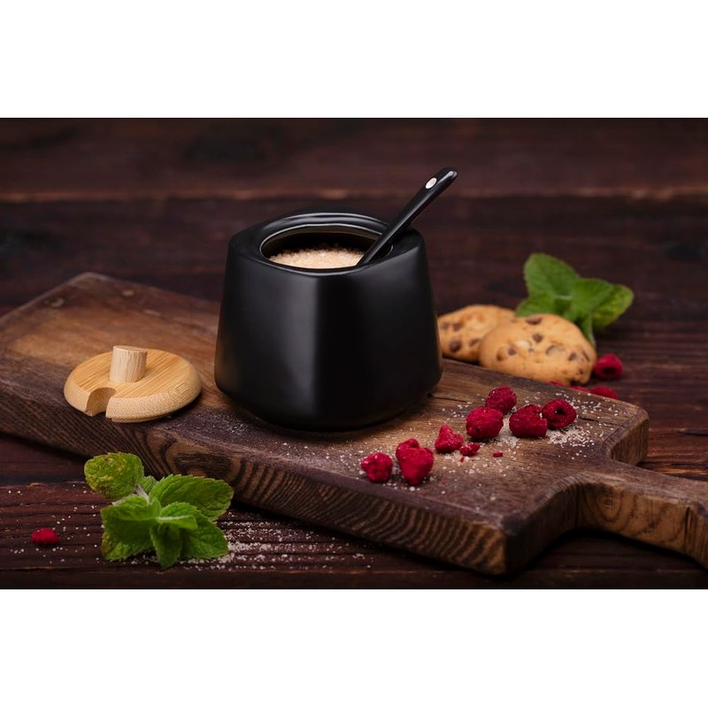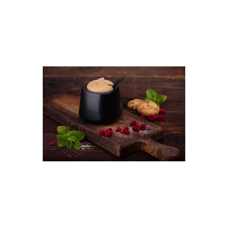 - An elegant storage for sugar with a bamboo wood lid and sugar spoon will complement any decor style. The lid is equipped with a cut-out for spoons