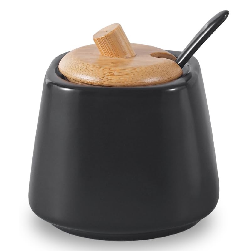Pullmer Ceramic Sugar Bowl with Bamboo Wood Lid and a Sugar Spoon, Sugar Container (Square, Round, Black)