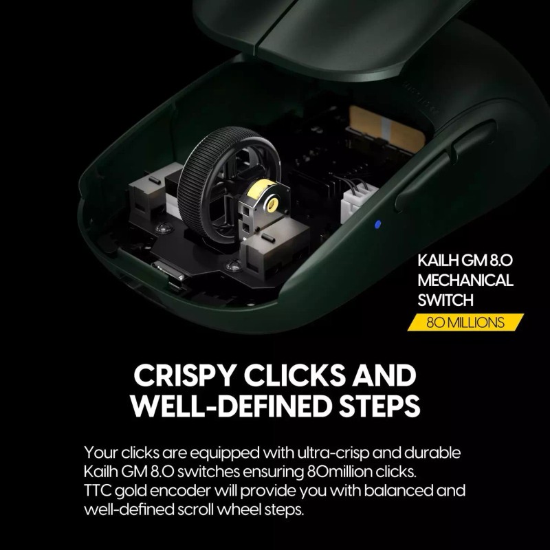 Your clicks are equipped with ultra-crisp and durable Kailh GM 8.0 switches ensuring 80million clicks. TTC gold encoder will provide you with balanced and well-defined scroll wheel steps.
