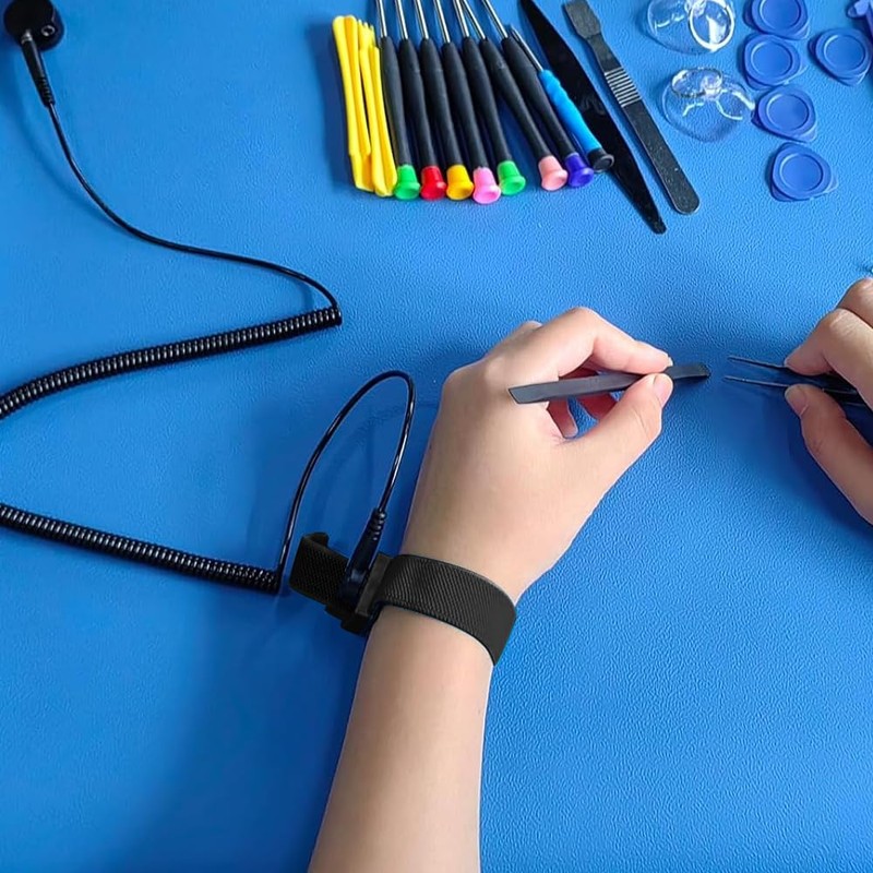 La pulsera antiestática tiene una resistencia incorporada de 1 MΩ, que protege sus componentes electrónicos de daños accidentales por descarga electrostática (ESD) durante las reparaciones. La pulsera antiestática elimina la electricidad estática del cuerpo humano en 0,1 segundos para igualar la carga entre la mano y los dispositivos electrónicos.
