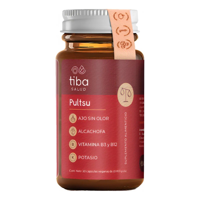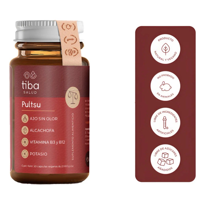 Pultsu Tiba Salud cápsulas veganas México, suplemento cardiovascular natural, ajo y alcachofa para corazón, cápsulas potasio B3 B12 presión arterial, suplemento vegano circulación.
