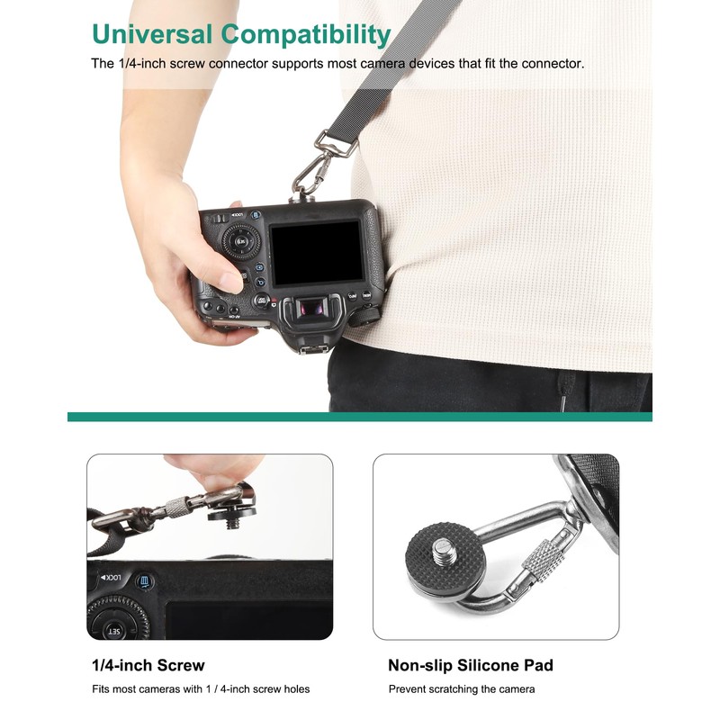 - 【Metal Connection Lock Design】The camera sling strap is equipped with a durable reinforced metal hook with a screw lock and stainless steel screws.The screw interface is thoughtfully designed with anti-slip pads to effectively protect the device when connecting the device.The 1/4-inch screw interface can be used with All camera devices using this interface are compatible.