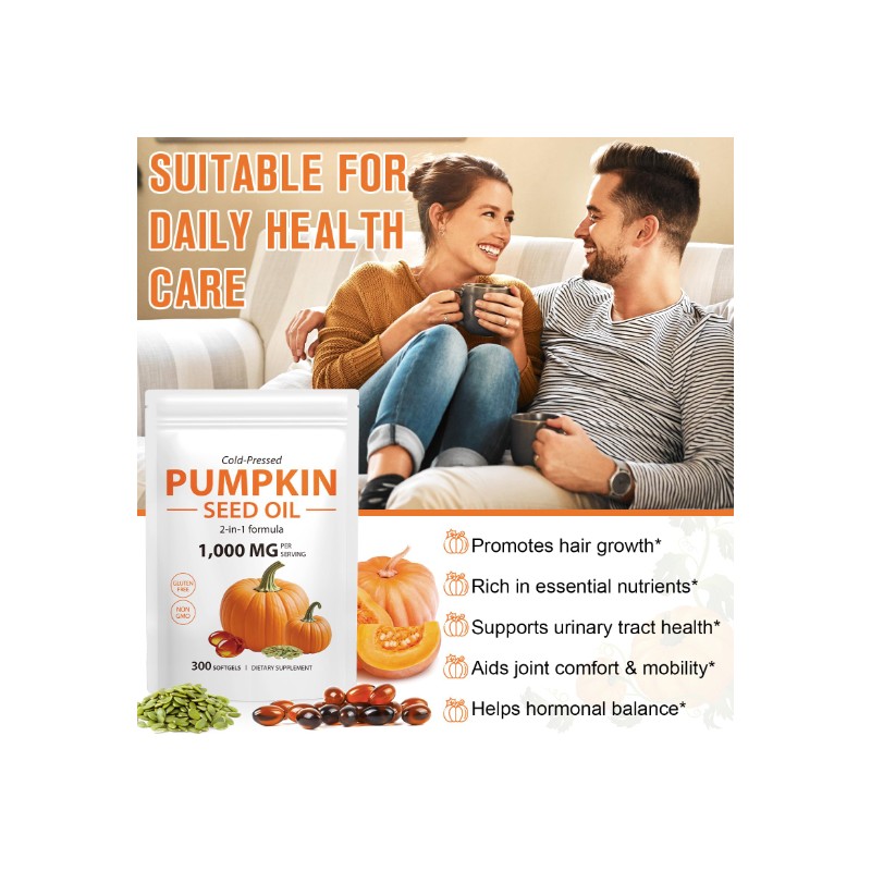 【Key Benefits】Pumpkin Seed Oil Capsules is a potent 2-in-1 supplement that combines a variety of cold-pressed ingredients to help maintain overall health. It is enriched with essential fatty acids and zinc, which help maintain prostate health, promote healthy urine flow, and enhance hair vitality. It is a convenient addition to your daily routine and is suitable for both men and women.