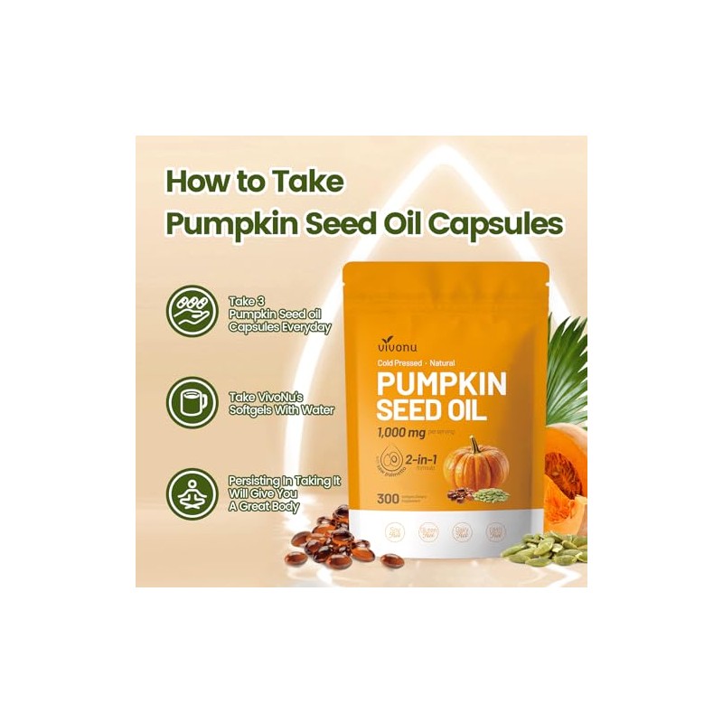 - VivoNu offers max strength virgin pumpkin seed oil softgels, high concentrated cold-pressed ingredients, 2-in-1 complex with saw palmetto extract, retains essential fatty acids, phytosterols, and antioxidants