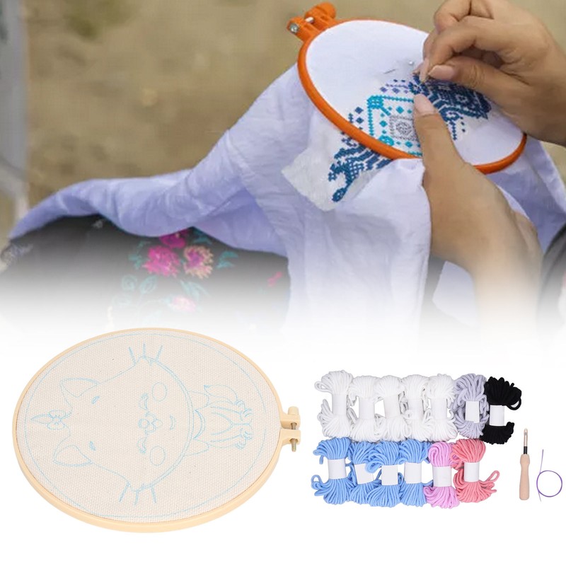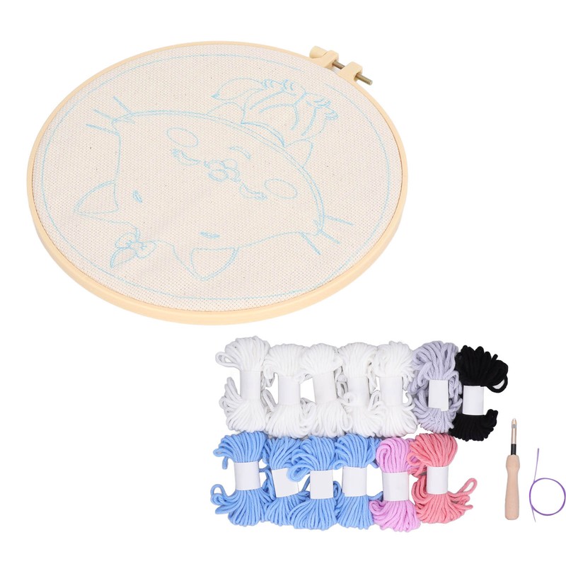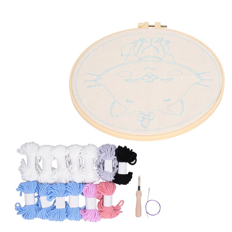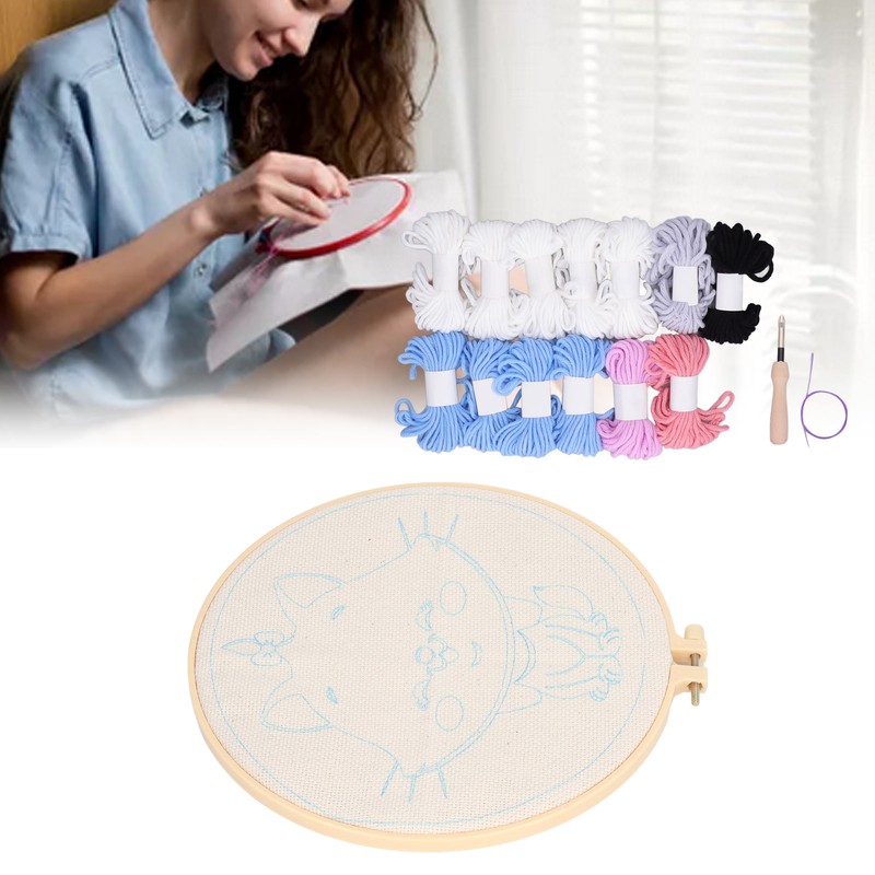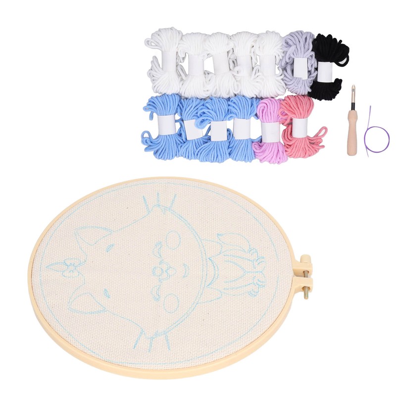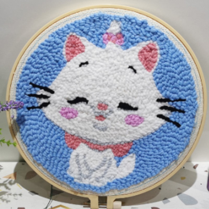 Punch Needle Kit Cute White Cat Easy Operation Glossy Frame 9.8in Hoop 13Pcs ...