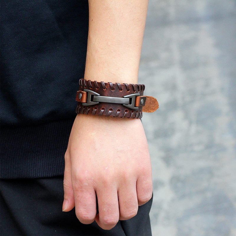 - LEATHER BRACELET FOR MEN: The leather wristband is about 9.5 inches long and 1.2 inches wide. With an adjustable strap, it is convenient for you to adjust the size until it fits your wrist. This leather bracelet comes in two colors: Classic brown and black.