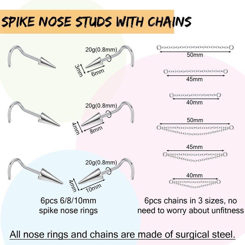 - ✿[Package and Size]: Package includes 3pairs nose ring with 6mm 8mm 10mm long spike, 6pcs chains in 40mm 45mm 50mm. All nose rings in 20 gauge (0.8mm).