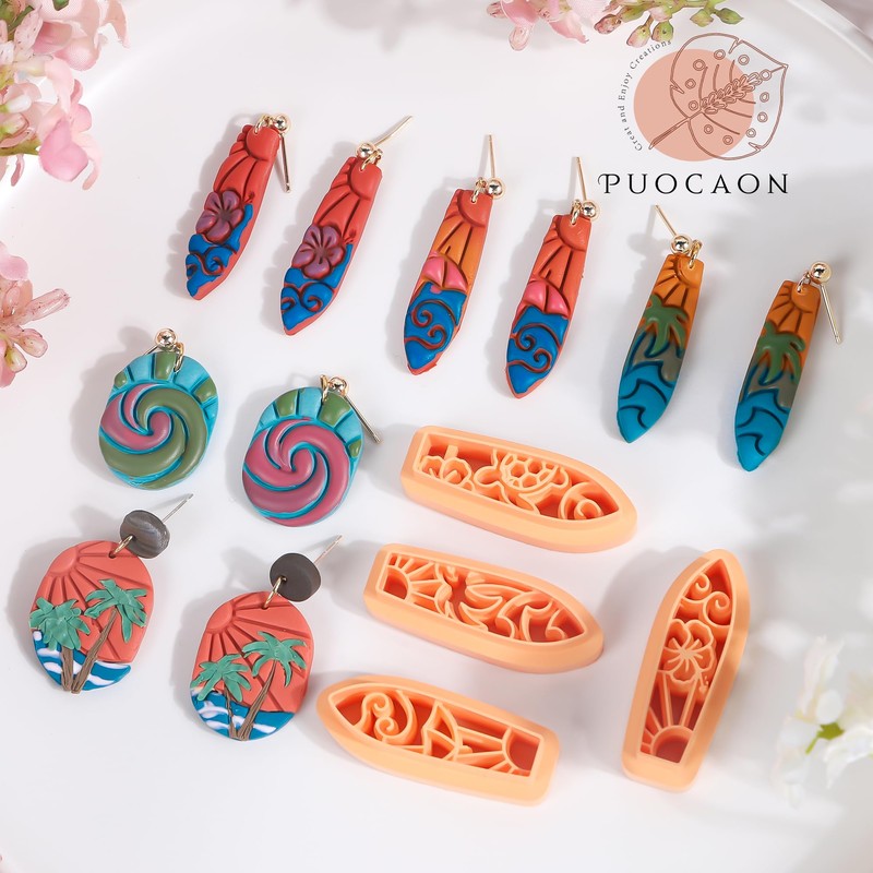 Puocaon Ocean Polymer Clay Cutters - 6 Pcs Clay Cutters for Polymer Clay Jewelry, Tropical Scenery Surfboard Clay Earring Cutters, Wave Sea Palm Tree Embossed Clay Cutters