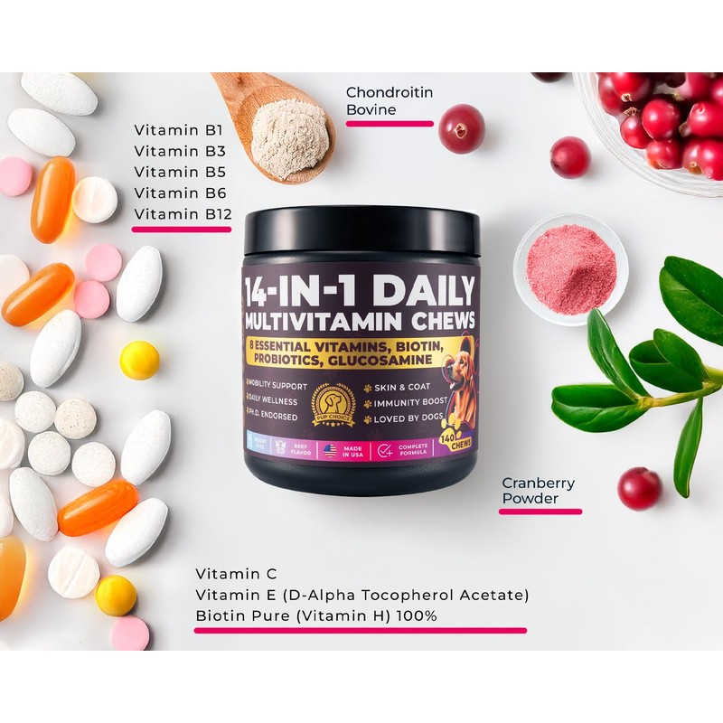 Pup Choice Multivitamin Treats for Dogs - PhD Endorsed 8 Essential Vitamins, Biotin, Probiotics, GLucosamin - Daily Wellness, Immunity, Skin & Coat, Mobility 140 Treats - Beef Flavor - Made in USA