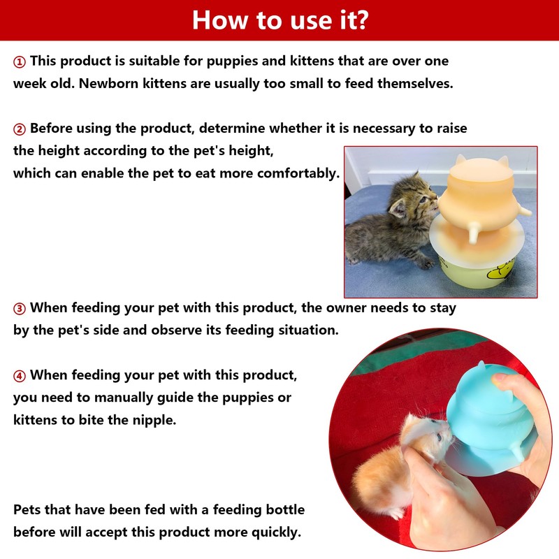 - Features: This product can feed multiple puppies, kittens and other pets at the same time. Its height is suitable for puppies and kittens. The base is designed with suction cups to prevent movement