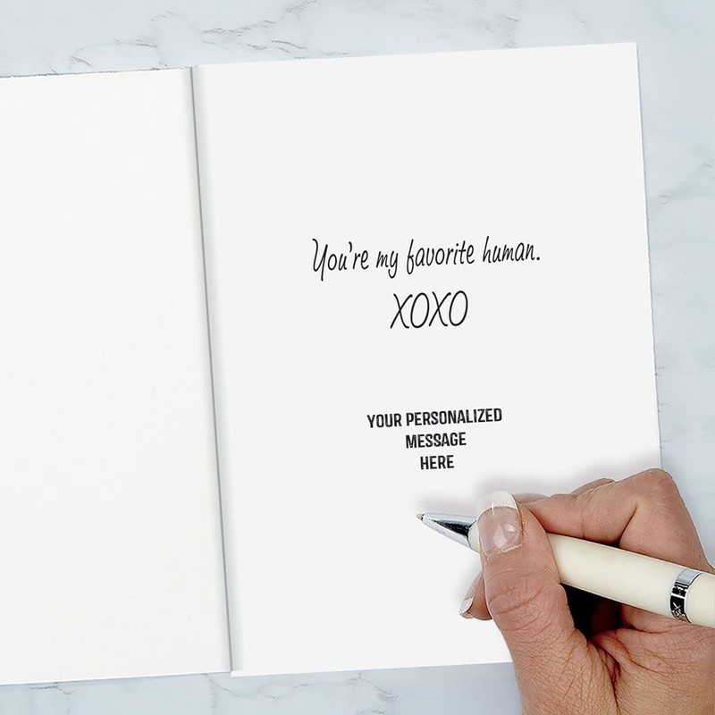 Valentine card are 5" x 7" and come with white envelope. Card Sentiments: Front: Happy Valentine's Day; Specify line 1 up to 12 characters. Inside: You're my favorite human. XOXO; Specify line 2-4 up to 30 characters each line.