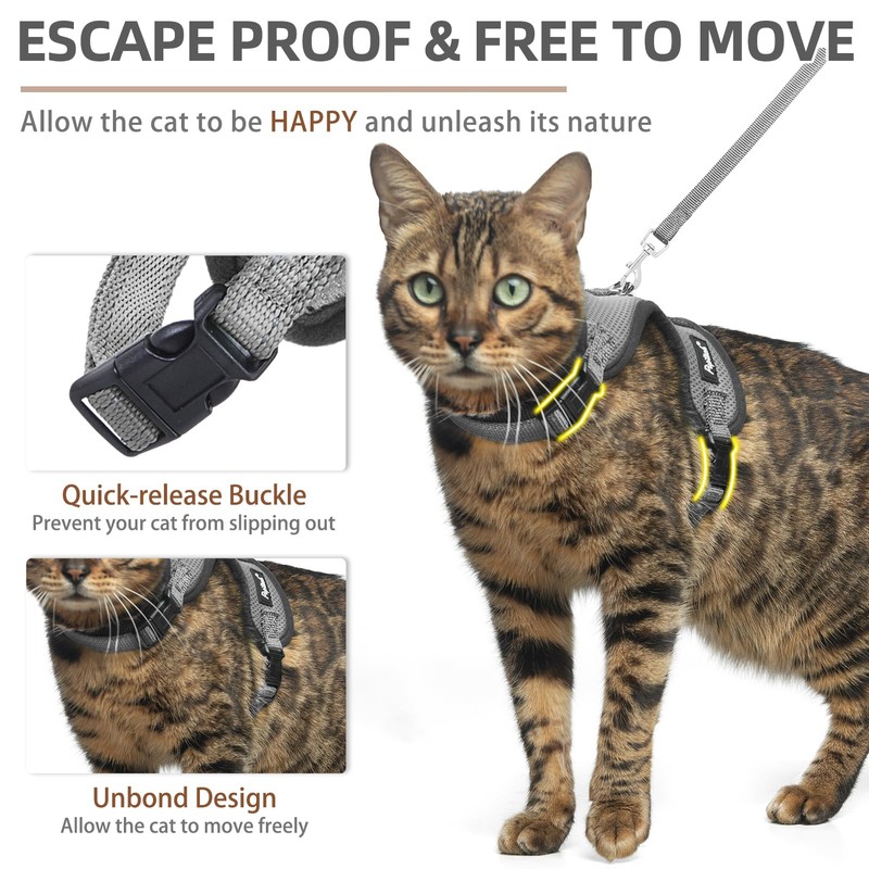 • SAFETY: The harness and leash are equipped with reflective strips so that cats can be seen in low-light environments, improving the safety of pets traveling at night. Sturdy D-rings provide strong support and allow cats to happily unleash their natural instincts.