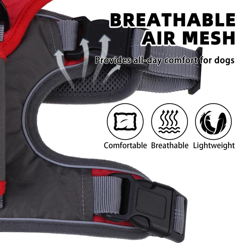 - COMFORTABLE & SAFE: High-quality webbing provides reliable strength to support your dog's activities of all intensities, and the soft, breathable air mesh has good heat dissipation to reduce friction on the fur while keeping your dog comfortable all day long. There are also reflective strips on the back of the harness and the webbing to ensure your dog's safety when walking at night.