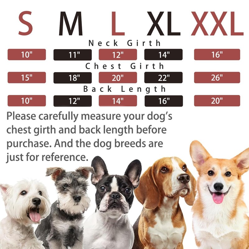 - MEASURE YOUR DOG: Make sure the dog's size fits perfectly as follows: Size XL, chest 22", back length 16", Neck 14". Measure around the widest point of your dog's chest and rib cage area to determine your dog's girth. And please leave two-finger room for comfort. Reference breeds for size XL: French Bulldog, Beagle, Dachshund, Cocker Spaniel, etc.