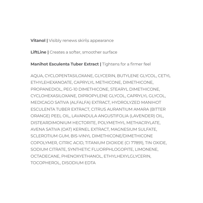 Ingredients: AQUA, CYCLOPENTASILOXANE, GLYCERIN, BUTYLENE GLYCOL, CETYL ETHYLEHEXANOATE, CAPRYLYL METHICONE, DIMETHICONE, PROPANEDIOL, PEG-10 DIMETHICONE, STEARYL DIMETHICONE, CYCLOHEXASILOXANE, DIPROPYLENE GLYCOL, CAPRYLYL GLYCOL, MEDICAGO SATIVA (ALFALFA) EXTRACT, HYDROLYZED MANIHOT ESCULENTA TUBER EXTRACT, CITRUS AURANTIUM AMARA (BITTER ORANGE) PEEL OIL, LAVANDULA ANGUSTIFOLIA (LAVENDER) OIL, DISTEARDIMONIUM HECTORITE, POLYMETHYL METHACRYLATE, AVENA SATIVA (OAT) KERNEL EXTRACT, MAGNESIUM SULFATE, SCLEROTIUM GUM, BIS-VINYL DIMETHICONE/DIMETHICONE COPOLYMER, CITRIC ACID, TITANIUM DIOXIDE (CI 77891), TIN OXIDE, SODIUM CITRATE, SYNTHETIC FLUORPHLOGOPITE, LIMONENE, OCTADECANE, PHENOXYETHANOL, ETHYLHEXYLGLYCERIN, TOCOPHEROL, DISODIUM EDTA.