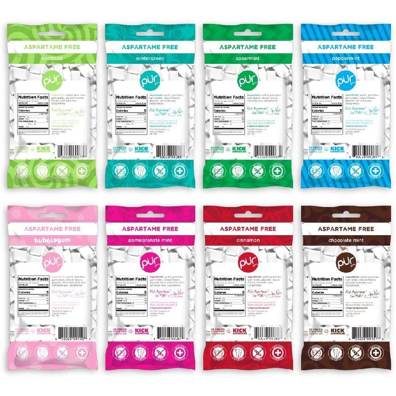 PUR Gum 8 Flavor Assortment Spearmint, Peppermint, Pomegranate Mint, Wintergreen, Cinnamon, Coolmint, Chocolate & Bubblegum