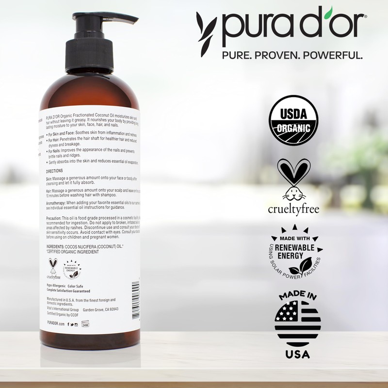 PURA D'OR brings one of nature's miracle beauty and personal care solutions to your doorstepFractionated Coconut Oil for hair. Compared to ordinary liquid coconut oil, Fractionated Coconut Oil for skin stays in its liquid form even at room temperature. It is quick to absorb once it touches the skin, making it an ideal carrier oil for essential oils. Fractionated Coconut Oil can be used as a moisturizer, makeup remover, and hair conditioner. It effectively nourishes dry skin and dull hair without leaving a greasy mess. This wonderful organic oil doesn't clog pores or leaves stains on clothing. PURA DOR Fractionated Coconut Oil for essential oils is USDA Certified Organic and bottled domestically at our environmentally friendly facilities.
