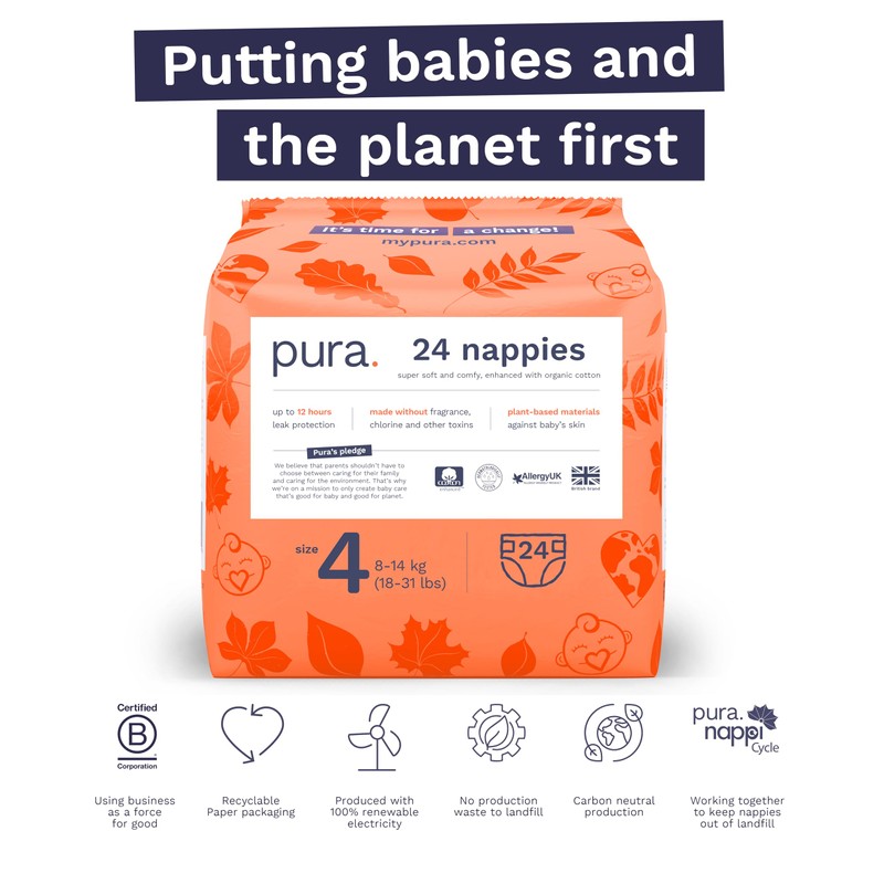 - SUSTAINABLY MADE: Pura’s nappies are manufactured in a carbon neutral plant, powered by green electricity. Where possible we’ve replaced oil-based plastics with plant-based materials such as wood pulp from sustainably managed forests.