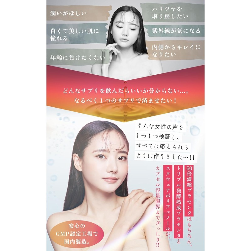 - 【豊富な美容成分】様々な美容成分が根本原因からトータルで集中ケア 。プラセンタ以外にも、超低分子コラーゲン、セラミド、ヒアルロン酸、エスラチン、プロテオグリカン、アスタキサンチン、ビタミンなど贅沢配合