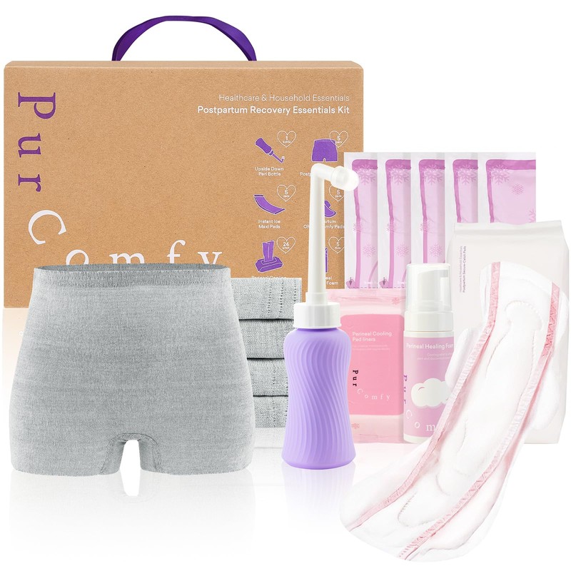 PurComfy 18 Pcs Postpartum Essentials Recovery Kit, Includes 5 Disposable Underwear, 24 Perineal Soothing Pad Liners, Perineal Soothing Foam, 5 Instant Ice Pads, Peri Bottle and 5 Postpartum Pads