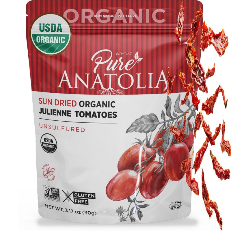 Pure Anatolia Organic Sun Dried Tomatoes Julienne Cut - Sundried Tomato, No Sugar Added, USDA Certified, No Preservatives, Kosher & Halal, Pack of 12