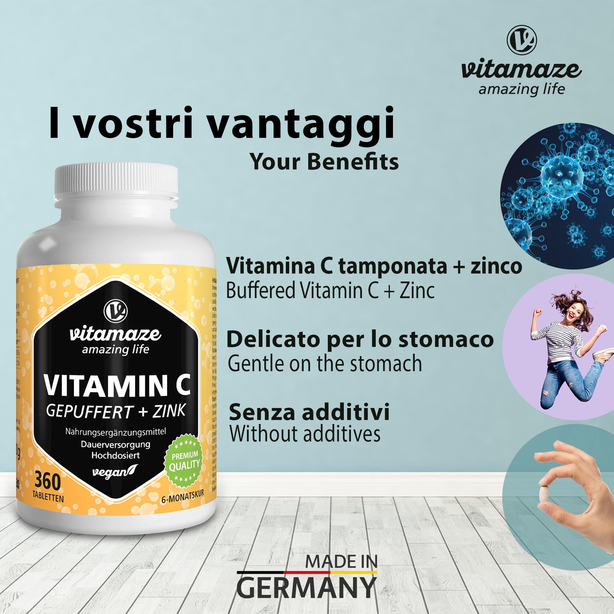 - HIGH DOSAGE: 360 vegan tablets with a daily dose of 1000 mg of vitamin C and 10 mg of zinc. In buffered form, our vitamin C tablets are particularly gentle on the stomach.