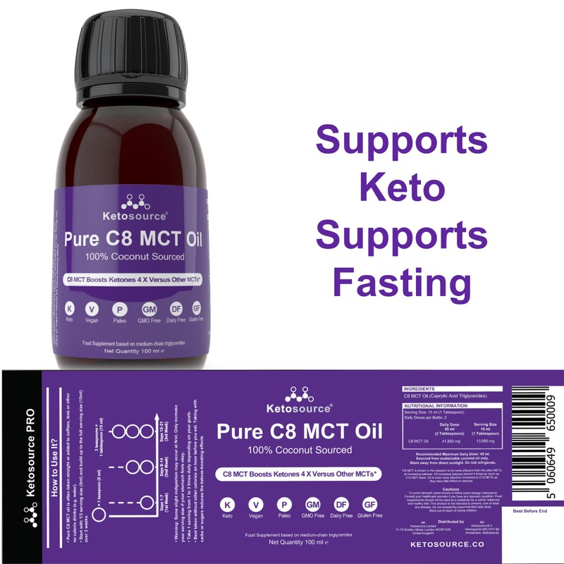 - ALL NATURAL, NON-ALLERGENIC & HIGHEST STANDARDS CERTIFICATION: Ketosource Pure C8 MCT Oil is Keto, Fasting, Vegan and Paleo friendly. Our natural C8 MCT is completely non-allergenic. It's certified free of gluten, dairy, nuts and shellfish. This is compliant with the strictest EU Directives and U.S. FDA. Our C8 MCT is produced in a BRC AA Global Standards compliant facility. It is also certified 100% sustainable & free of genetically modified organisms (GMO).