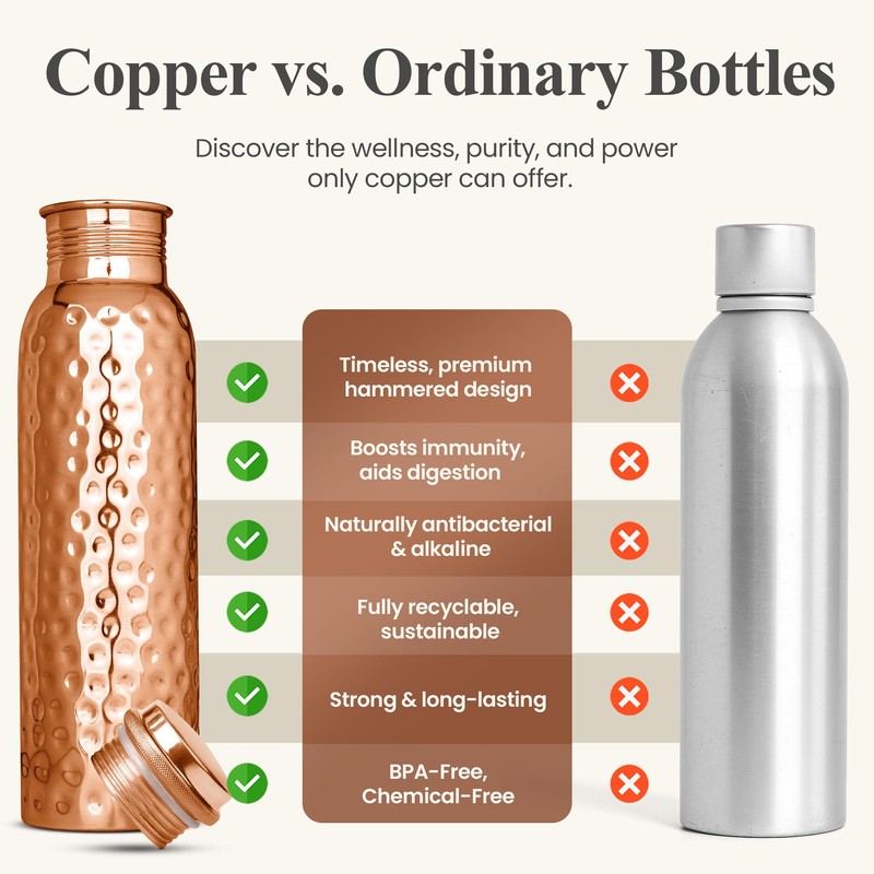 - 🌞 Naturally Alkalizes Water – When stored overnight, copper charges water with natural antioxidants and minerals, promoting digestion, better immunity, and radiant skin.
