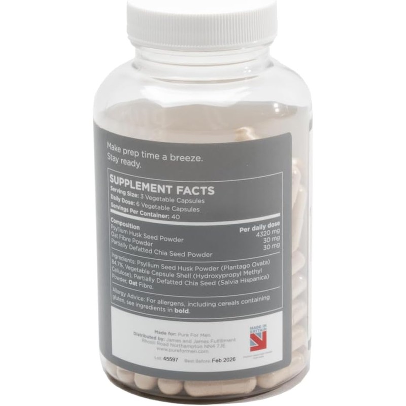 Pure for Men Original Cleanliness Stay Ready Fiber Supplement, 120 Vegan Capsules, Helps Promote Digestive Regularity. Psyllium Husk, Chia Seeds, Oat Fibre, Proprietary Formula