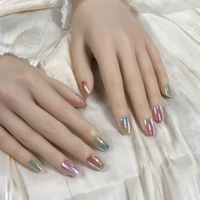 Pure Handmade Nails Press on Nail Reusable Fake Nails Dazzling Colour Aurora Cat's Eye Bling Bling Nude Medium Stick on Nails French Tip False Nails 10pcs (M, Q262)