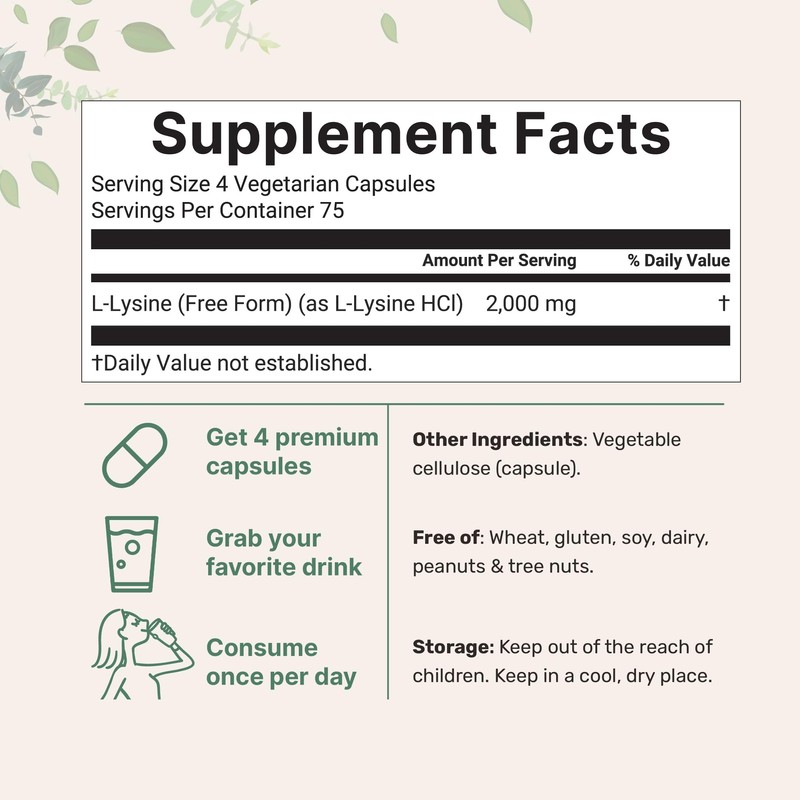 - Each bottle includes 300 natural veggie capsules, providing 2,000mg of maximum potency L-Lysine as L-Lysine Hydrochloride (HCl) per serving.