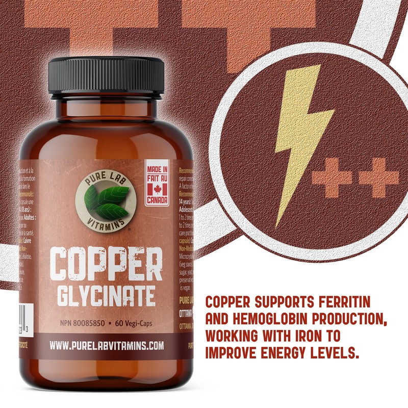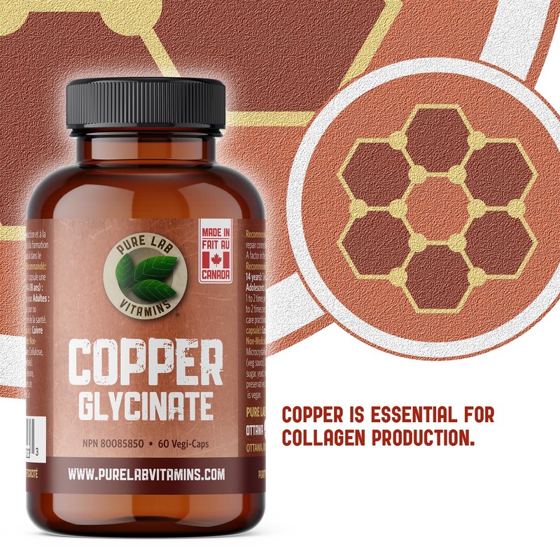 Pure Lab Vitamins - Copper Glycinate Mineral Supplement 1 mg 60 v-caps | Essential for Collagen Production, Immune System & Red Blood Cell Formation | Non GMO, Gluten Free | Formulated and made in Canada