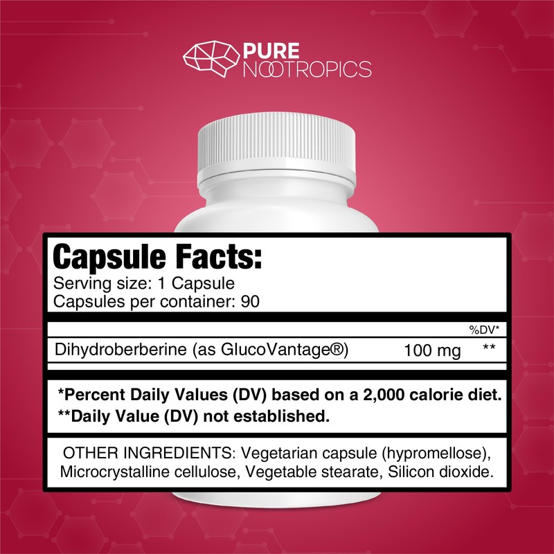 Pure Nootropics - Dihydroberberine Supplement (GlucoVantage) 100 mg, 90 Capsules | Super Berberine