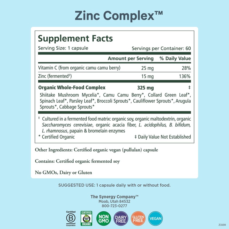 - ZINC SUPPLEMENT & ORGANIC COFACTORS: Each bottle (60 capsules) offers complete immune support from zinc and key cofactors like organic vitamin C from camu camu extract, mushrooms, and vegetables.