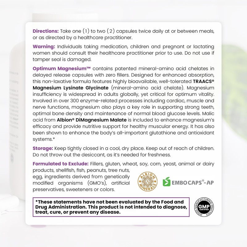 - IMPROVED ABSORPTION: Optimum Magnesium features highly bioavailable, well-tolerated Magnesium Lysinate Glycinate chelate, plus Malic Acid from Di-Magnesium Malate for increased efficacy. To further improve absorption, Optimum Magnesium utilizes EmboCaps for a delayed release of 45 minutes into the small intestine. This delayed release allows for optimal absorption and bioavailability.