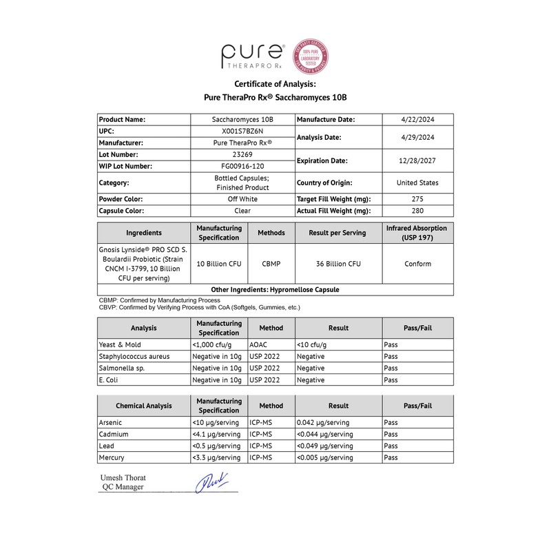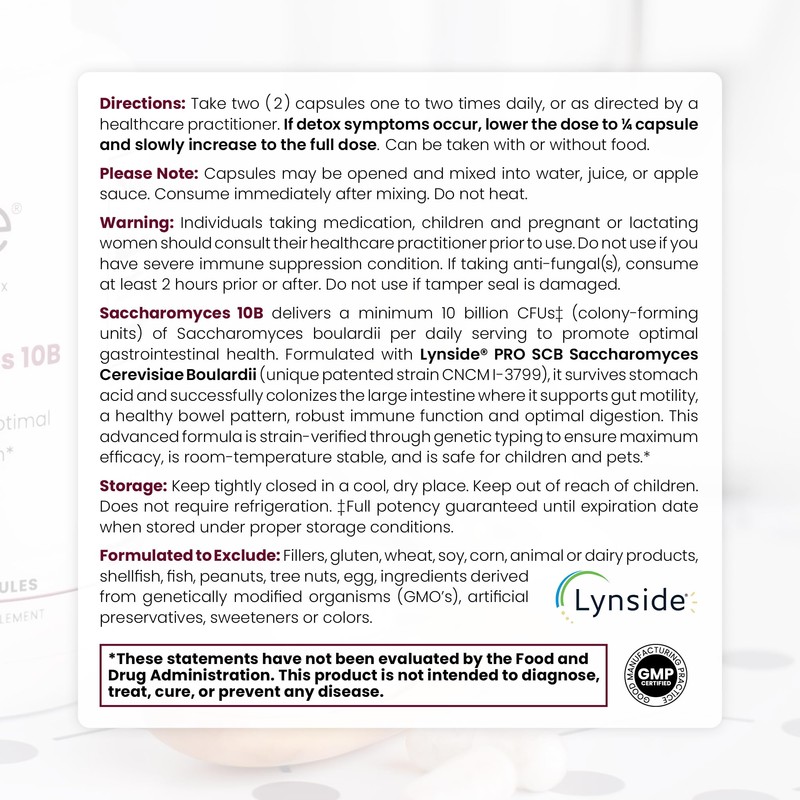 - SACCHAROMYCES BOULARDII PROBIOTIC: Saccharomyces is a patented & clinically studied strain that has been used for its regulatory effect on the intestinal flora, helping to maintain normal balance in the intestine.