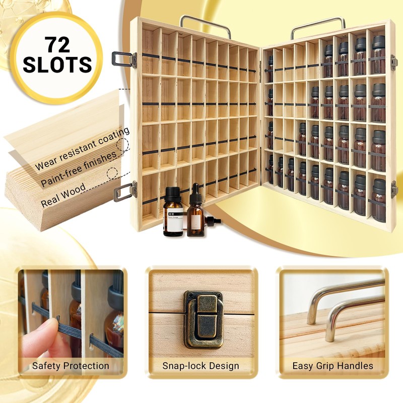 • DURABLE & SAFE STORAGE – Keep your essential oils together with our well-built and sturdy wooden case. Get rid of the clutter and keep your oils clean and organized. It features 72 slots for 5 ml, 10 ml and 15 ml essential oil bottles. Box Size: Approx. 35 x 28 x 11 cm / 13.78' x 11.02' x 4.33'; Package Include: 1 x Wooden Essential Oil Bottle Box; 1 x Bottle Cap Labels; 1 x Fragrance Tester Strips.